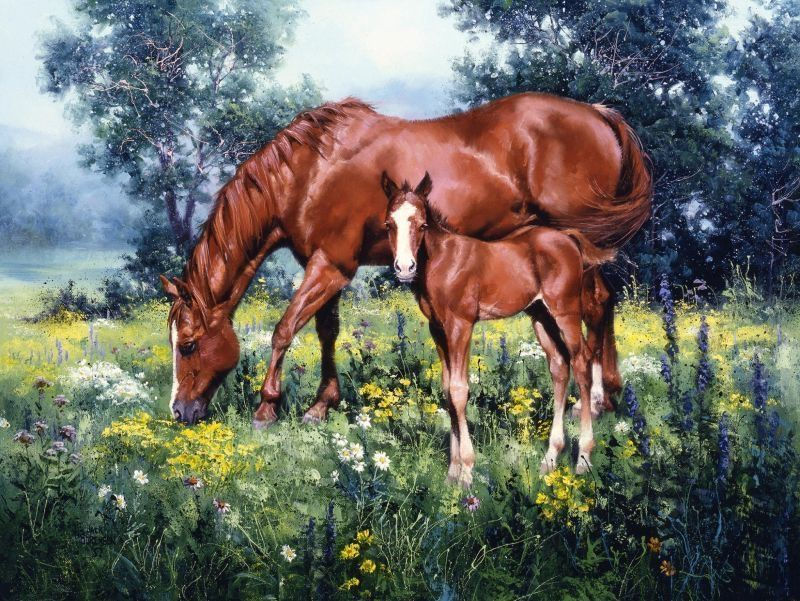 To me, there's nothing prettier than a good-looking mare and colt standing in a field of wildflowers. Some of my favorite days as a painter have been spent in a pasture with several mares and foals in the spring.