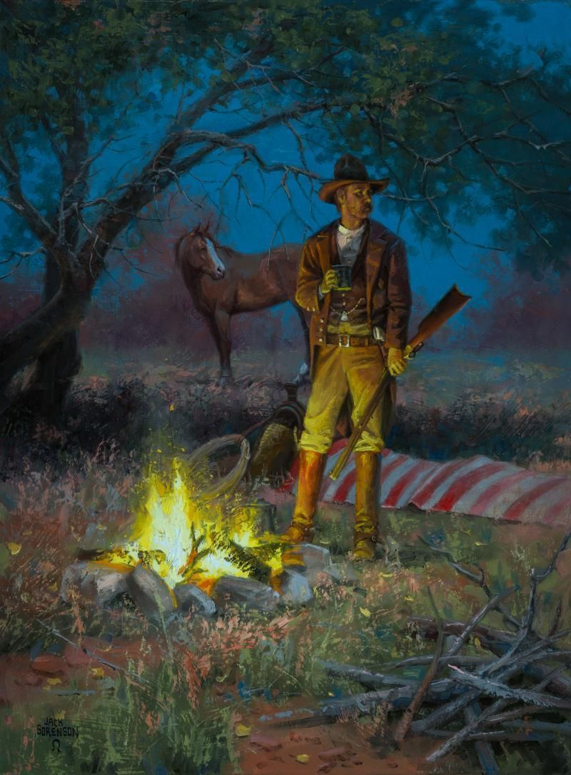 This is one of those paintings that make the viewer write the story line. Is this an outlaw? Maybe he's a lawman. Whatever, that Henry is in his hand for a reason, and he and his horse have heard something in the distance. You decide.
