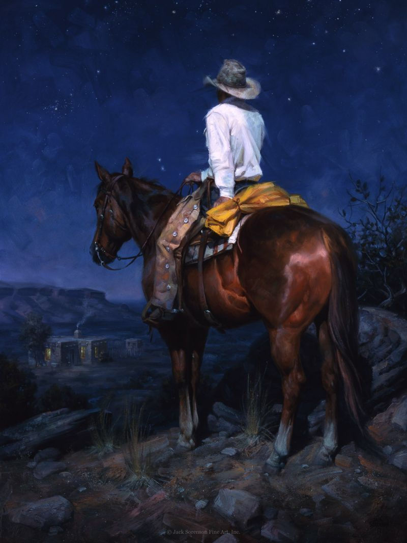 A lone mounted cowboy sits atop a hill in the moonlight starring down at an old adobe home. Was it the home he grew up in? Was it an old girlfriend's home, or maybe the first home he shared with his wife and kids? I'll let you decide.
