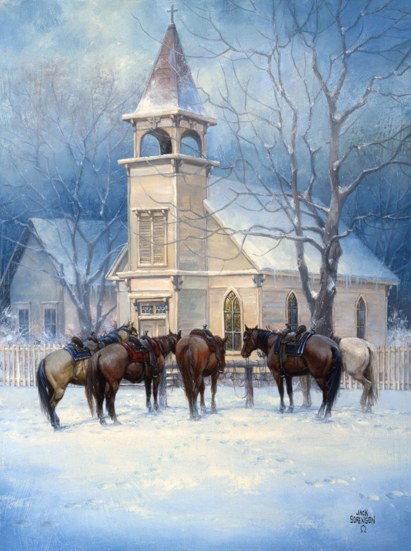 This group of horses spends each Sunday at this hitchin' rail in front of this Chapel. They know that once the service is over, They'll each receive a treat. This painting was a best selling Christmas card for Leanin' Tree for several years.